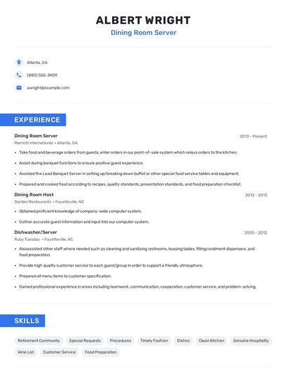 Build a professional dining room server resume in minutes. Browse through our resume examples to identify the best way to word your resume. Then choose from 5+ resume templates to create your dining room server resume.