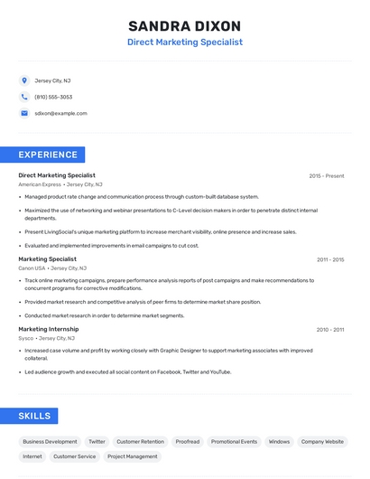 Build a professional direct marketing specialist resume in minutes. Browse through our resume examples to identify the best way to word your resume. Then choose from 5+ resume templates to create your direct marketing specialist resume.
