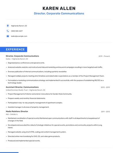 Build a professional director, corporate communications resume in minutes. Browse through our resume examples to identify the best way to word your resume. Then choose from 5+ resume templates to create your director, corporate communications resume.