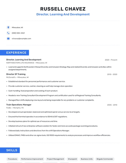 Build a professional director, learning and development resume in minutes. Browse through our resume examples to identify the best way to word your resume. Then choose from 5+ resume templates to create your director, learning and development resume.