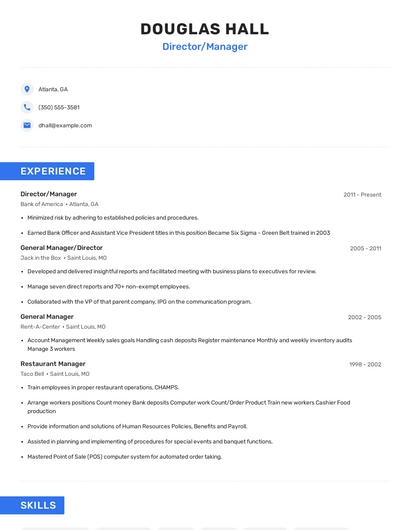 Build a professional director/manager resume in minutes. Browse through our resume examples to identify the best way to word your resume. Then choose from 5+ resume templates to create your director/manager resume.