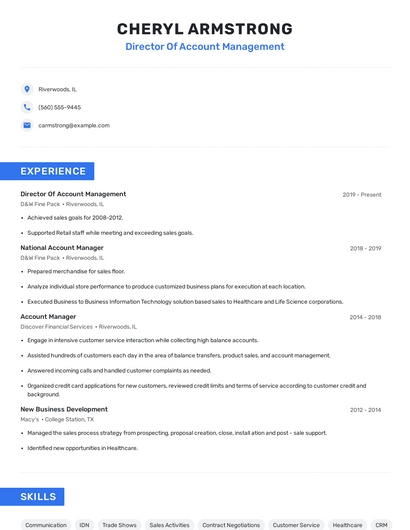 Build a professional director of account management resume in minutes. Browse through our resume examples to identify the best way to word your resume. Then choose from 5+ resume templates to create your director of account management resume.