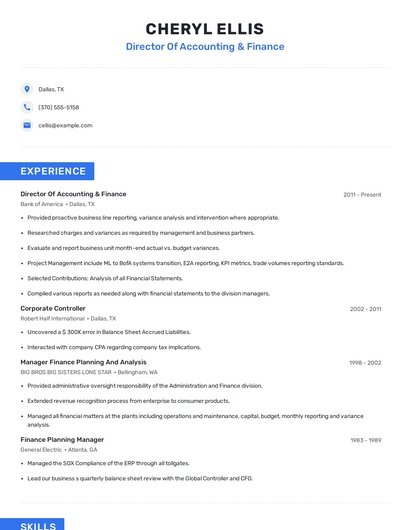 Build a professional director of accounting & finance resume in minutes. Browse through our resume examples to identify the best way to word your resume. Then choose from 5+ resume templates to create your director of accounting & finance resume.