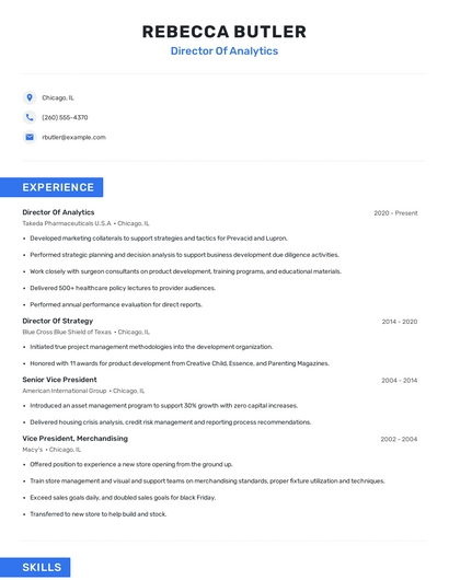 Build a professional director of analytics resume in minutes. Browse through our resume examples to identify the best way to word your resume. Then choose from 5+ resume templates to create your director of analytics resume.