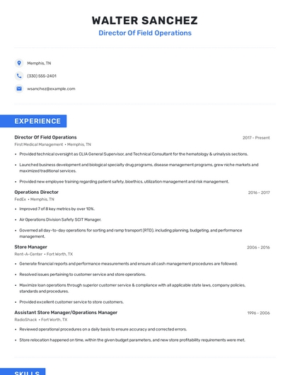 Build a professional director of field operations resume in minutes. Browse through our resume examples to identify the best way to word your resume. Then choose from 5+ resume templates to create your director of field operations resume.
