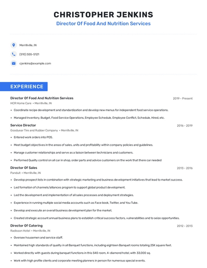 Build a professional director of food and nutrition services resume in minutes. Browse through our resume examples to identify the best way to word your resume. Then choose from 5+ resume templates to create your director of food and nutrition services resume.