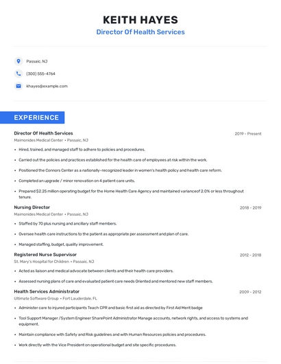 Build a professional director of health services resume in minutes. Browse through our resume examples to identify the best way to word your resume. Then choose from 5+ resume templates to create your director of health services resume.