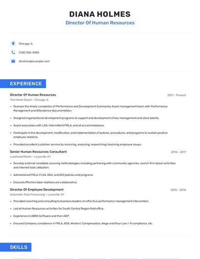 Build a professional director of human resources resume in minutes. Browse through our resume examples to identify the best way to word your resume. Then choose from 5+ resume templates to create your director of human resources resume.