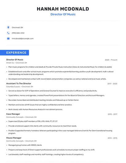 Build a professional director of music resume in minutes. Browse through our resume examples to identify the best way to word your resume. Then choose from 5+ resume templates to create your director of music resume.