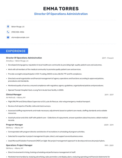 Build a professional director of operations administration resume in minutes. Our AI resume writing assistant will guide you through every step of the process, and you can choose from 10+ resume templates to create your director of operations administration resume.7. Quality Care