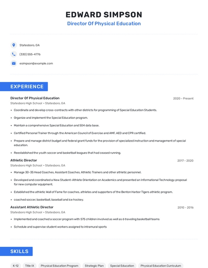 Build a professional director of physical education resume in minutes. Browse through our resume examples to identify the best way to word your resume. Then choose from 5+ resume templates to create your director of physical education resume.