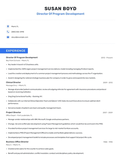 Build a professional director of program development resume in minutes. Browse through our resume examples to identify the best way to word your resume. Then choose from 5+ resume templates to create your director of program development resume.