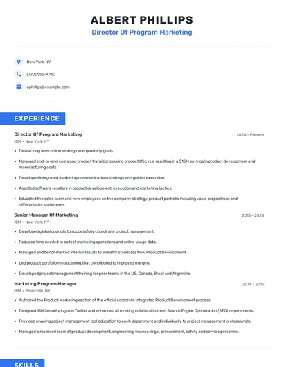 Build a professional director of program marketing resume in minutes. Browse through our resume examples to identify the best way to word your resume. Then choose from 5+ resume templates to create your director of program marketing resume.
