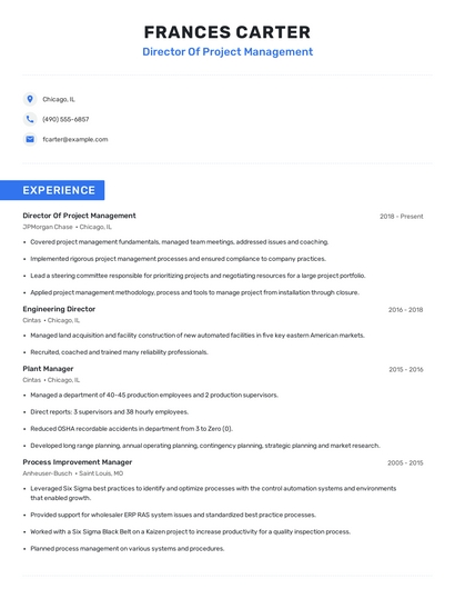 Build a professional director of project management resume in minutes. Browse through our resume examples to identify the best way to word your resume. Then choose from 5+ resume templates to create your director of project management resume.