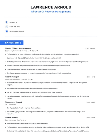 Build a professional director of records management resume in minutes. Browse through our resume examples to identify the best way to word your resume. Then choose from 5+ resume templates to create your director of records management resume.