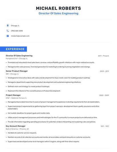 Build a professional director of sales engineering resume in minutes. Browse through our resume examples to identify the best way to word your resume. Then choose from 5+ resume templates to create your director of sales engineering resume.