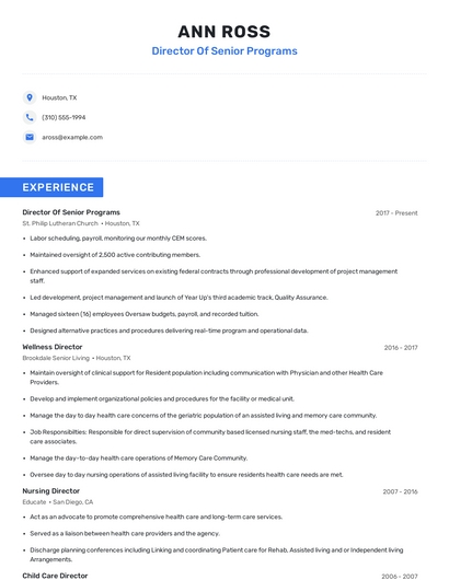 Build a professional director of senior programs resume in minutes. Browse through our resume examples to identify the best way to word your resume. Then choose from 5+ resume templates to create your director of senior programs resume.