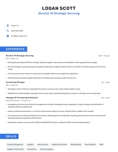 Build a professional director of strategic sourcing resume in minutes. Browse through our resume examples to identify the best way to word your resume. Then choose from 5+ resume templates to create your director of strategic sourcing resume.