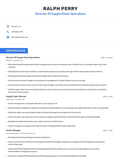 Build a professional director of supply chain operations resume in minutes. Browse through our resume examples to identify the best way to word your resume. Then choose from 5+ resume templates to create your director of supply chain operations resume.