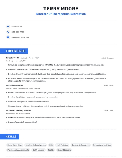 Build a professional director of therapeutic recreation resume in minutes. Browse through our resume examples to identify the best way to word your resume. Then choose from 5+ resume templates to create your director of therapeutic recreation resume.