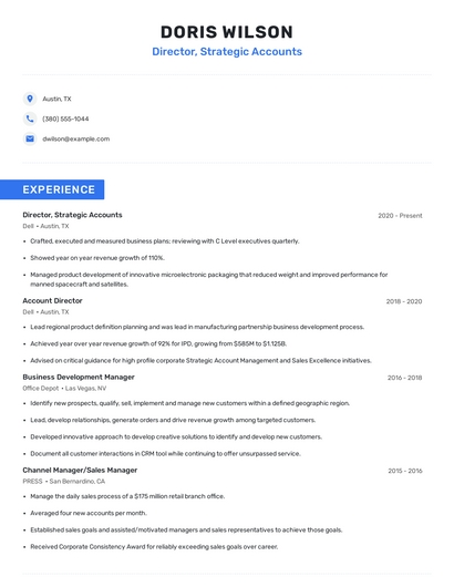 Build a professional director, strategic accounts resume in minutes. Browse through our resume examples to identify the best way to word your resume. Then choose from 5+ resume templates to create your director, strategic accounts resume.