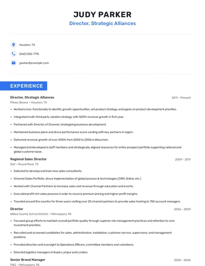 Build a professional director, strategic alliances resume in minutes. Browse through our resume examples to identify the best way to word your resume. Then choose from 5+ resume templates to create your director, strategic alliances resume.