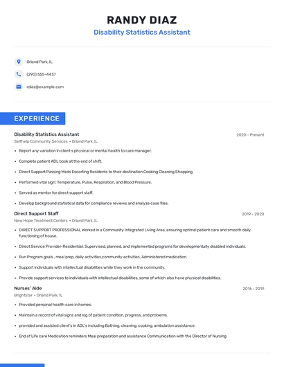 Build a professional disability statistics assistant resume in minutes. Our AI resume writing assistant will guide you through every step of the process, and you can choose from 10+ resume templates to create your disability statistics assistant resume.7. Meal Preparation