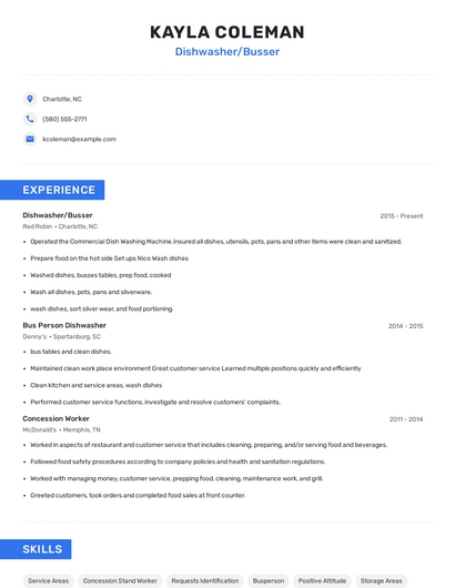 Build a professional dishwasher/busser resume in minutes. Browse through our resume examples to identify the best way to word your resume. Then choose from 5+ resume templates to create your dishwasher/busser resume.