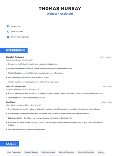 Build a professional dispatch assistant resume in minutes. Our AI resume writing assistant will guide you through every step of the process, and you can choose from 10+ resume templates to create your dispatch assistant resume.7. Emergency Situations
