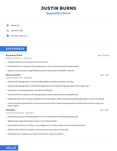 Build a professional dispatcher/driver resume in minutes. Browse through our resume examples to identify the best way to word your resume. Then choose from 5+ resume templates to create your dispatcher/driver resume.
