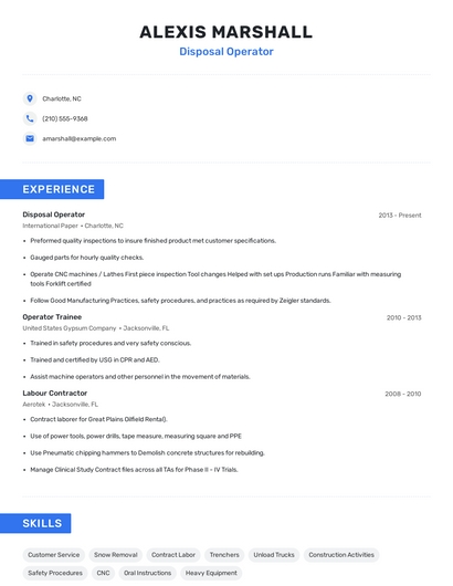 Build a professional disposal operator resume in minutes. Browse through our resume examples to identify the best way to word your resume. Then choose from 5+ resume templates to create your disposal operator resume.
