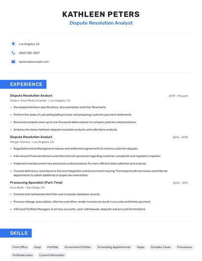 Build a professional dispute resolution analyst resume in minutes. Browse through our resume examples to identify the best way to word your resume. Then choose from 5+ resume templates to create your dispute resolution analyst resume.