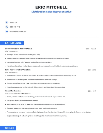 Build a professional distribution sales representative resume in minutes. Browse through our resume examples to identify the best way to word your resume. Then choose from 5+ resume templates to create your distribution sales representative resume.