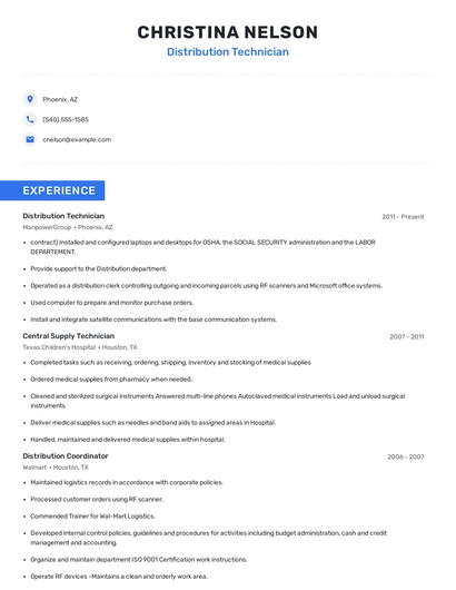 Build a professional distribution technician resume in minutes. Browse through our resume examples to identify the best way to word your resume. Then choose from 5+ resume templates to create your distribution technician resume.