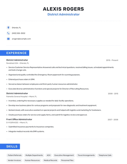 Build a professional district administrator resume in minutes. Browse through our resume examples to identify the best way to word your resume. Then choose from 5+ resume templates to create your district administrator resume.