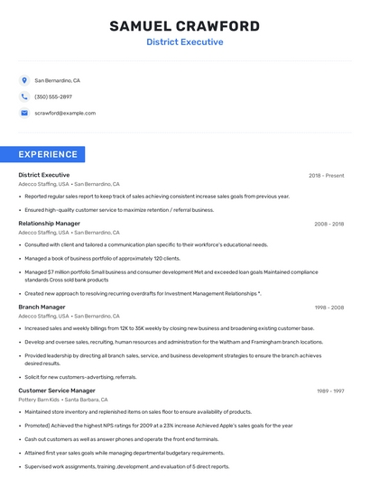 Build a professional district executive resume in minutes. Browse through our resume examples to identify the best way to word your resume. Then choose from 5+ resume templates to create your district executive resume.