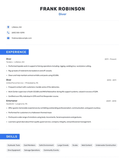 Build a professional diver resume in minutes. Browse through our resume examples to identify the best way to word your resume. Then choose from 5+ resume templates to create your diver resume.