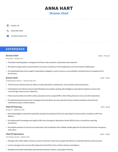 Build a professional division chief resume in minutes. Browse through our resume examples to identify the best way to word your resume. Then choose from 5+ resume templates to create your division chief resume.