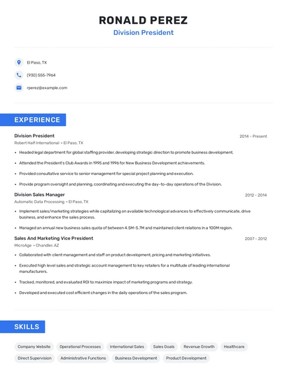 Build a professional division president resume in minutes. Browse through our resume examples to identify the best way to word your resume. Then choose from 5+ resume templates to create your division president resume.