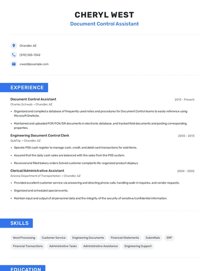 Build a professional document control assistant resume in minutes. Browse through our resume examples to identify the best way to word your resume. Then choose from 5+ resume templates to create your document control assistant resume.