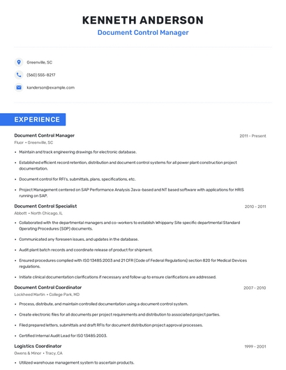 Build a professional document control manager resume in minutes. Browse through our resume examples to identify the best way to word your resume. Then choose from 5+ resume templates to create your document control manager resume.