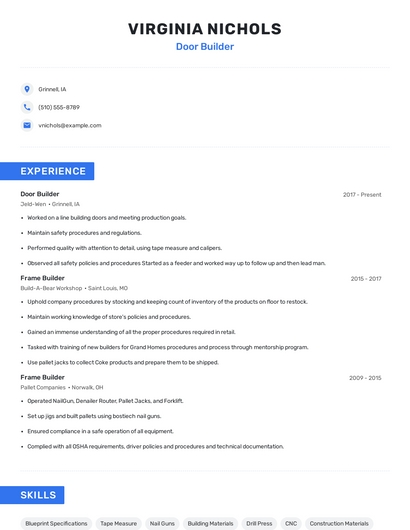 Build a professional door builder resume in minutes. Browse through our resume examples to identify the best way to word your resume. Then choose from 5+ resume templates to create your door builder resume.