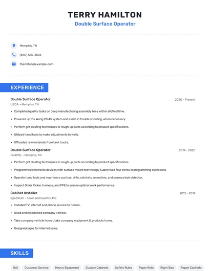 The most important skills for a double surface operator resume and required skills for a double surface operator to have include: