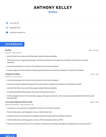 Build a professional drafter resume in minutes. Browse through our resume examples to identify the best way to word your resume. Then choose from 5+ resume templates to create your drafter resume.