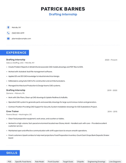 Build a professional drafting internship resume in minutes. Browse through our resume examples to identify the best way to word your resume. Then choose from 5+ resume templates to create your drafting internship resume.