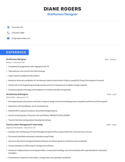 Build a professional draftsman/designer resume in minutes. Browse through our resume examples to identify the best way to word your resume. Then choose from 5+ resume templates to create your draftsman/designer resume.