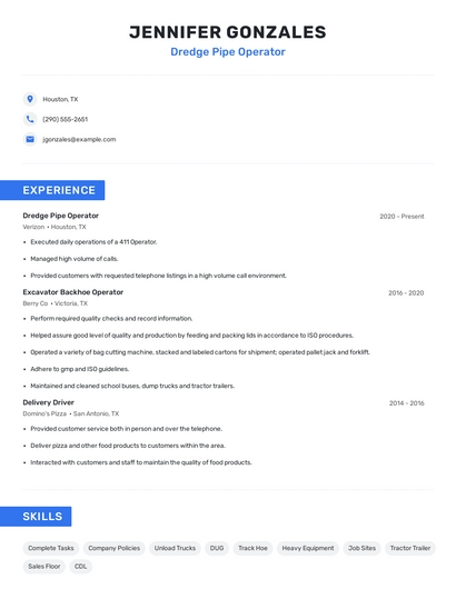 Build a professional dredge pipe operator resume in minutes. Browse through our resume examples to identify the best way to word your resume. Then choose from 5+ resume templates to create your dredge pipe operator resume.