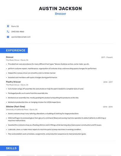 The most important skills for a dresser resume and required skills for a dresser to have include: