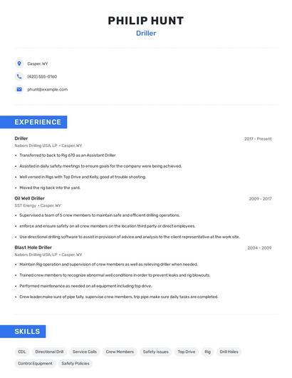 Build a professional driller resume in minutes. Browse through our resume examples to identify the best way to word your resume. Then choose from 5+ resume templates to create your driller resume.