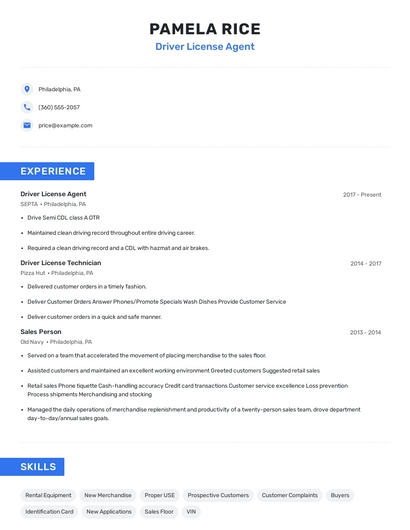 Build a professional driver license agent resume in minutes. Our AI resume writing assistant will guide you through every step of the process, and you can choose from 10+ resume templates to create your driver license agent resume.7. MVA